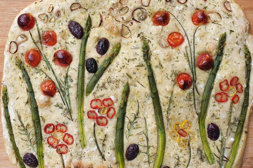 Blanchierter grüner Spargel, Oliven, Tomaten, Zwiebeln, milde Peperoni und diverse Kräuter dekorieren mein Flower Focaccia
