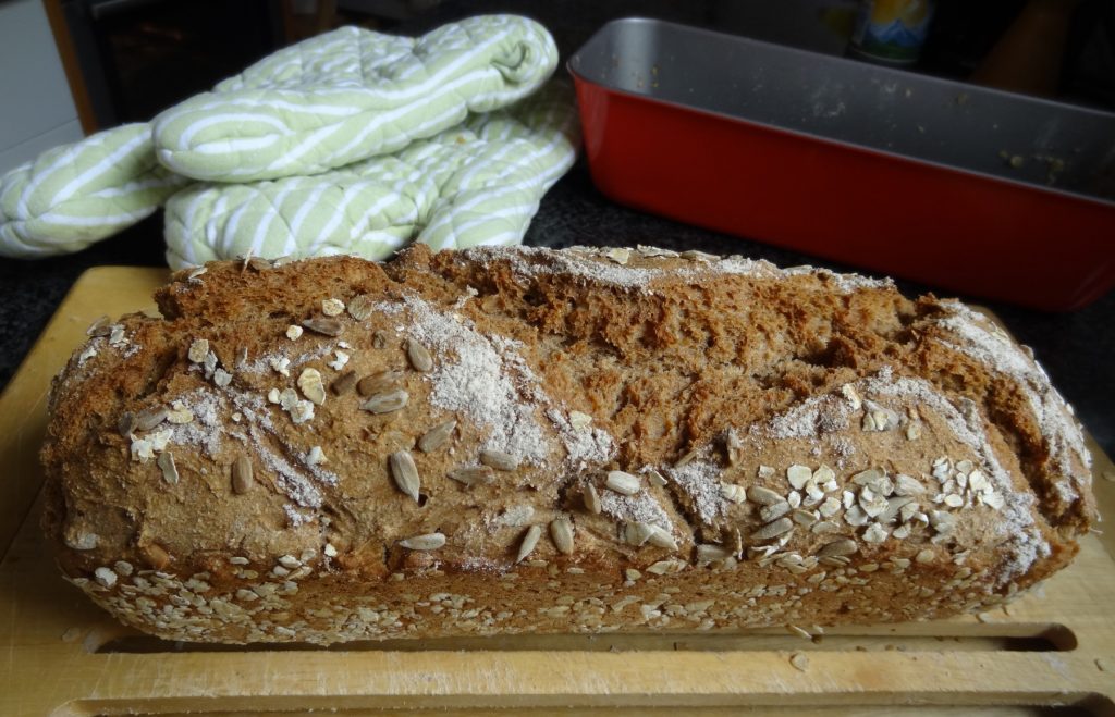 Ganz sicher wird dem Australier mein selbst gebackenes Brot schmecken. Das hoffe ich jedenfalls. Das backe ich nämlich zur Freude aller immer dann, wenn ich keine Zeit zum Einkaufen habe und die Tiefkühl-Brotvorräte aufgebraucht sind. Es ist ein schnelles Hefebrot aus Vollkornweizenmehl. Oft backe ich die doppelte Menge in der extragroßen Kastenform, damit es wenigstens für zwei Tage reicht. Der Clou an dem Rezept ist, dass der Teig nicht vor dem Backen gehen muss. Die Form mit dem Brotteig kommt einfach in den kalten Backofen. Während der langsam aufheizt, geht das Brot wunderbar auf. Nebenbei verbreitet es einen tollen Duft im ganzen Haus. Zeitaufwand für mich (ohne Spülen) etwa 15 Minuten. Dazu das Lob der Familie. Passt!